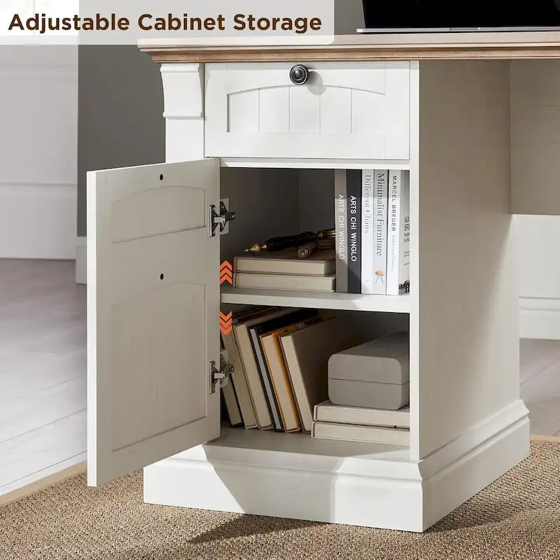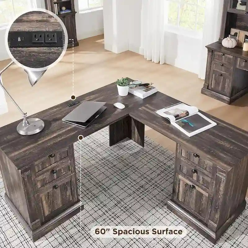 The antique finish and rustic wood top create a warm, welcoming look that complements various dcor styles. 60 x 60 generous tabletop surface provides room for all your must-have office essentials laptop, notebooks, decor, and of course other items you wish to place. Two USB ports and two power outlets to make charging electronics a breeze. 3 standard drawers to store your paper pads, notebooks, calculator, and other things you want close at hand. It also features a file drawer that holds letter-size hanging files, thus keeping your documents organized and easy to find. The storage cabinet can store and organize your supplies. Adjustable shelves within the cabinets allow you to customize the unit as per your storage needs.