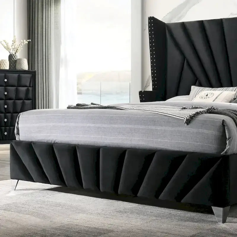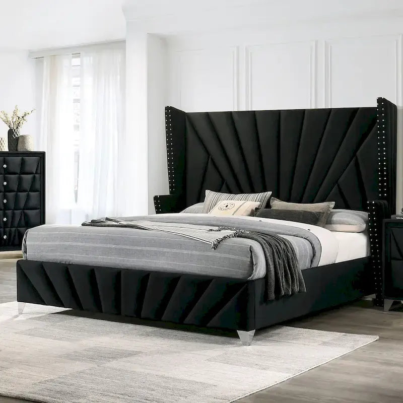 Decidedly glamorous, this tufted wingback bed is a gorgeous focal point in a bold bedroom. It features black upholstery with angular tufting over a tall headboard and low footboard. Gleaming nailhead trim and chrome finish feet add a sparkling finishing touch.